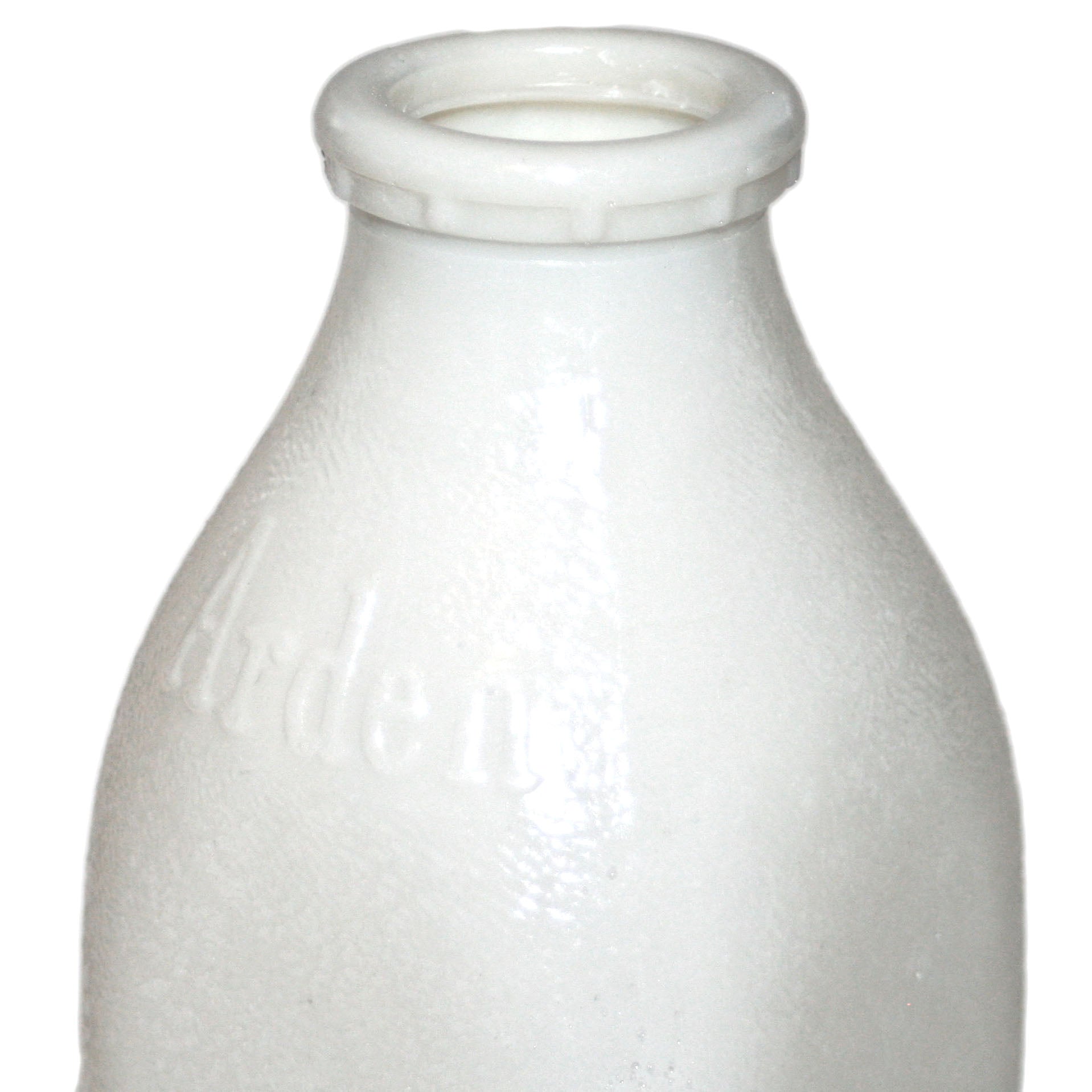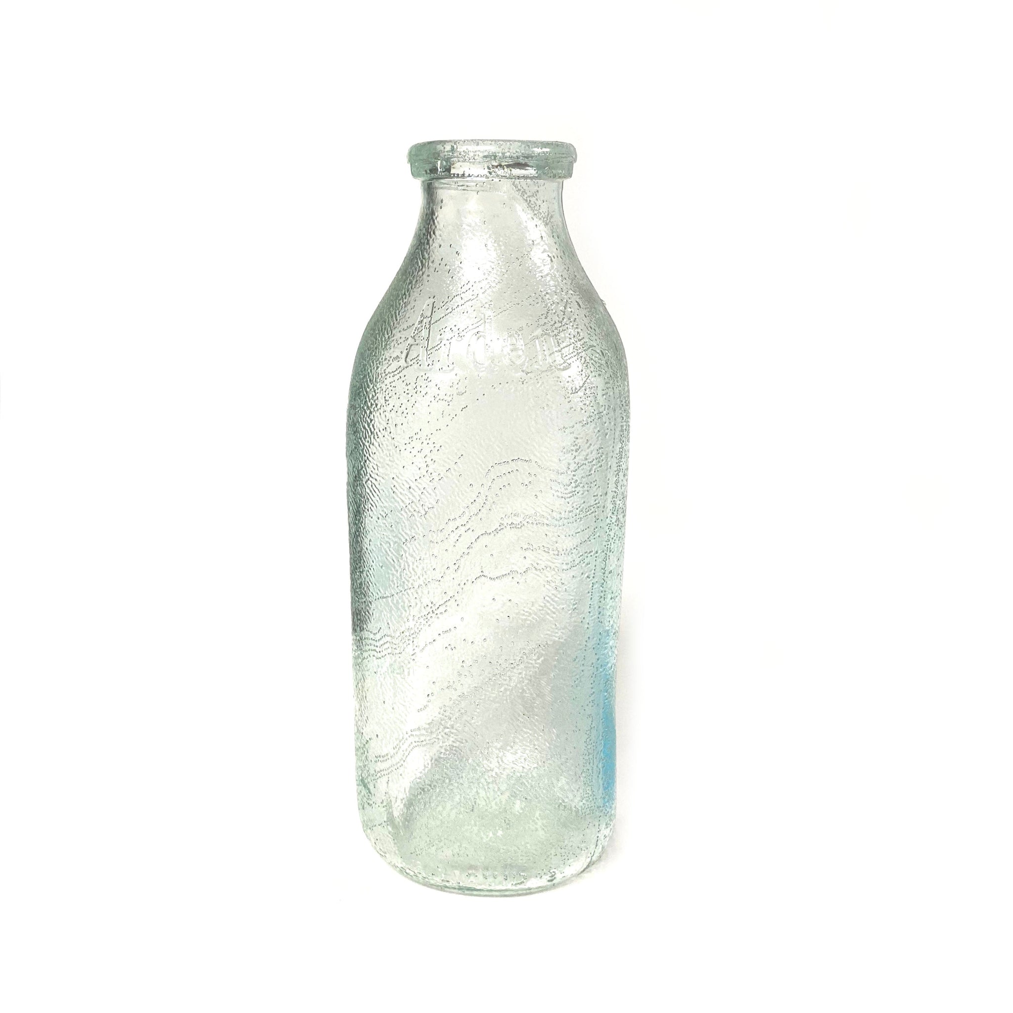 This old fashioned western style rectangular milk bottle features a unique pebble texture surface that looks incredibly authentic in opaque white or translucent colors (Our favorite is light blue translucent). It comes embossed with the words "Arden" and "Liquid" on the bottle shoulder slope.