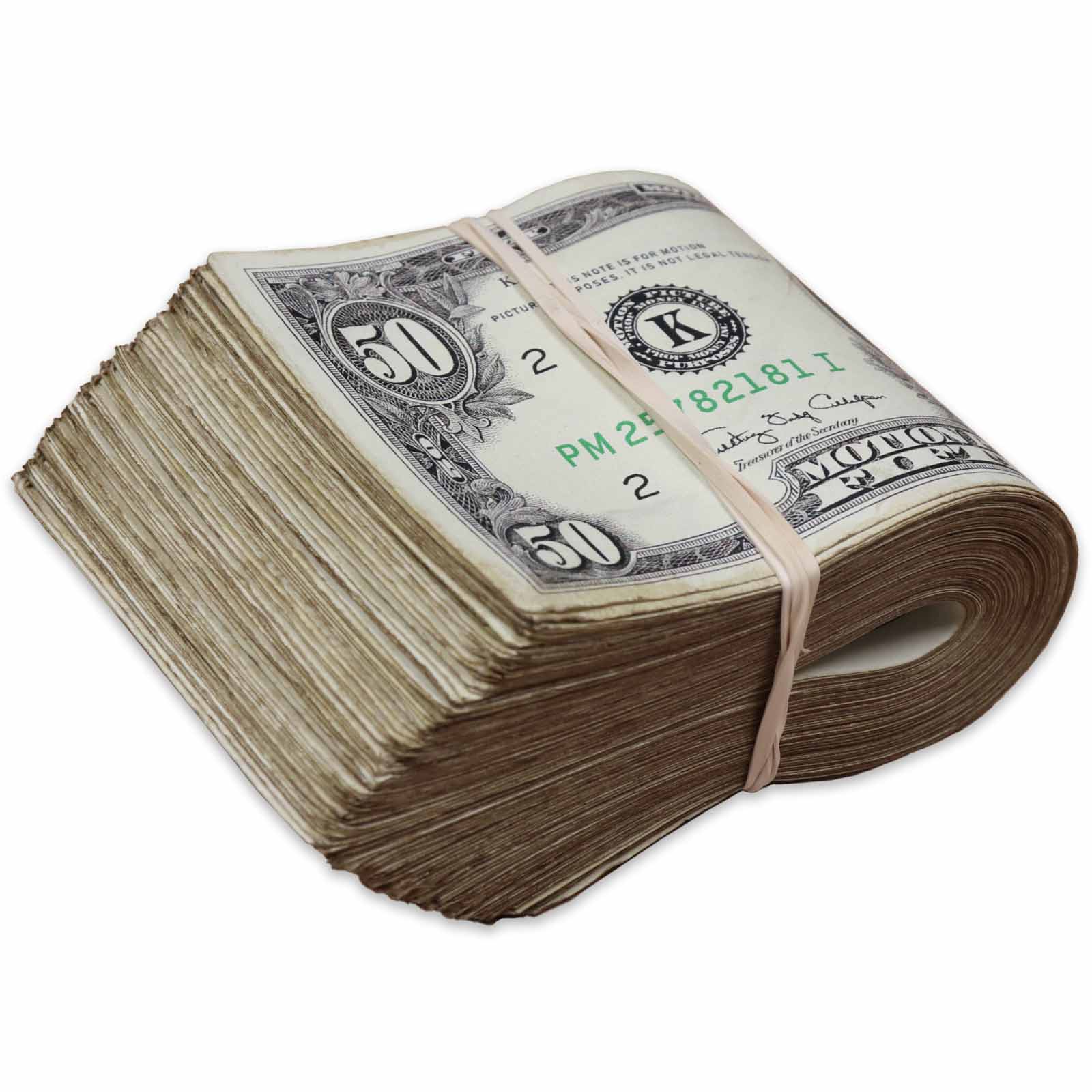 Make your next music video, movie, film, or ad more realistic looking with these high-quality bills. Featuring one hundred 1990 series aged bills in $50 denominations, this band offers a total of $5,000 in prop money. The unmatched quality and non-glossy finish makes these prop bills look like the real thing. Double-sided full print for added realism, this prop money band is sure to make any production stand out.